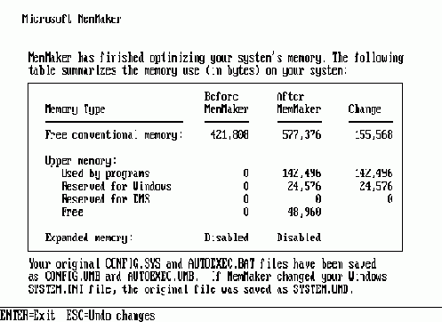 Если вы удовлетворены результатами оптимизации, нажмите клавишу <Enter>. При этом вы веренетесь в MS-DOS. Если оптимизация не дала ожидаемых результатов, нажмите клавишу <Esc>, при этом все изменения будут удалены.
